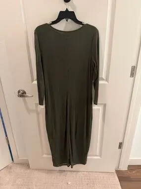 Olive ribbed midi dress with a V-neck. Button-front closure runs down the center. Long sleeves with a slim, streamlined fit. Soft stretch fabric for easy wear.
