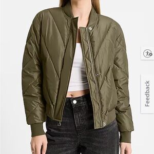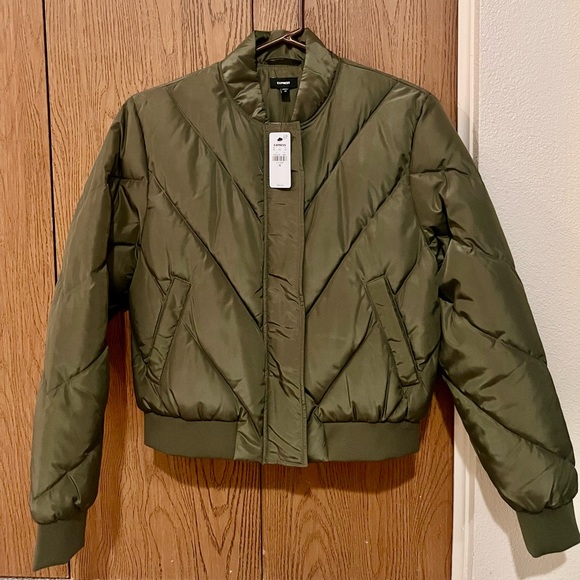 Chic olive puffer jacket by Express. Features quilted design. Ideal for warmth and style. New with tags.