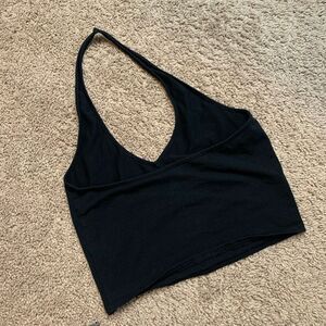 Express One Eleven blac halter top. V neck line with a neck strap. Cropped length. Stretchy.