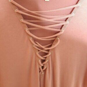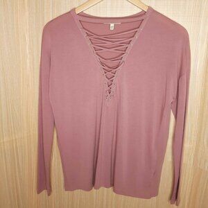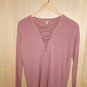 Women’s Express One Eleven lace up front long sleeve top. Has a cute lace up front detail and is super soft and stretchy. Gently used condition with some wash wear. Measurements are: 19 ½” drop sleeve, 16” from armpit to hem, 24 ½” from armpit to armpit, and 26” from shoulder to hem.