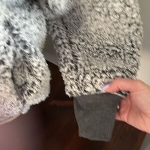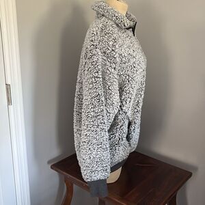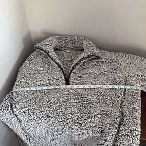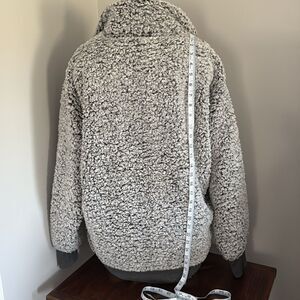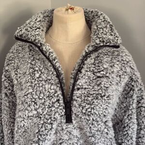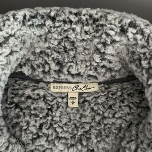 Excellent condition, Express One Eleven Oversized Sherpa 1/4 Zip Sweatshirt Size S. Color gray - 2 pockets in the front. 100% polyester-machine wash cold. See pictures for length and armpit to armpit measurements.