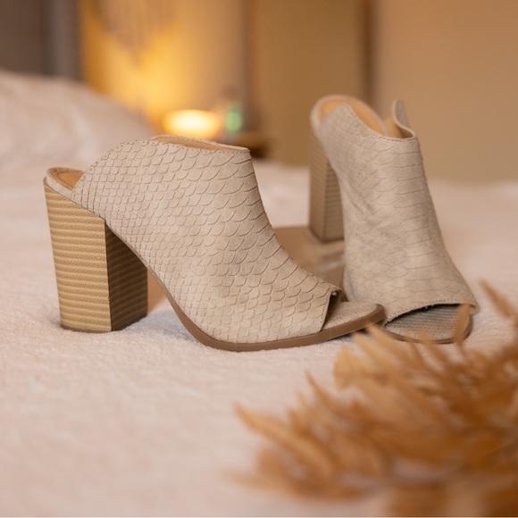 A beautiful neutral grey/tan open toe snakeskin bootie! Worn maybe twice!