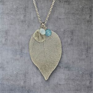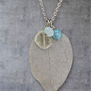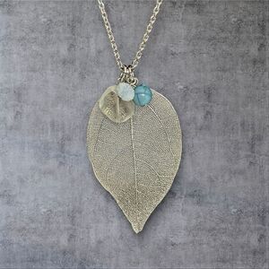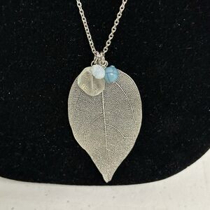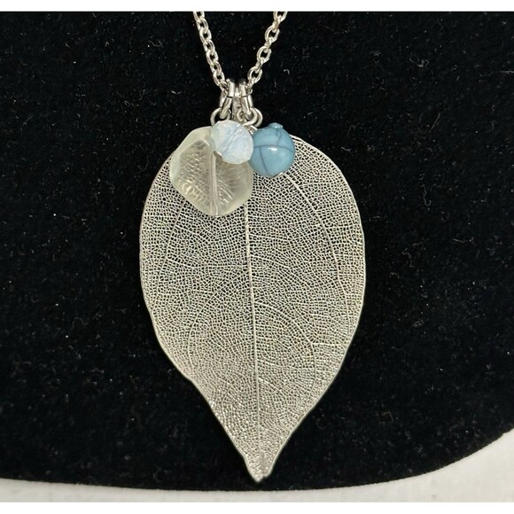 This is a beautiful openwork silver tone leaf pendant with three accent beads.