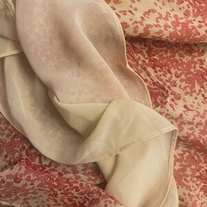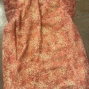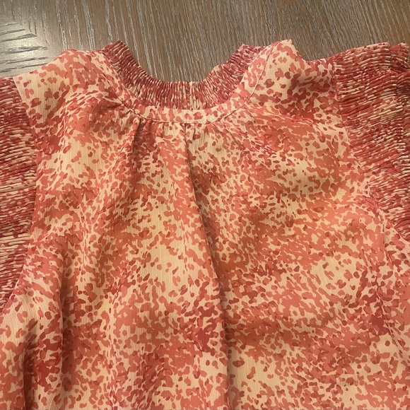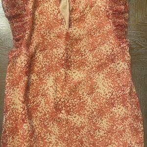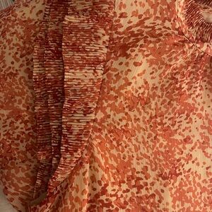 Stylish blouse with vibrant orange pattern. Features elegant ruffle details. Perfect for any occasion.