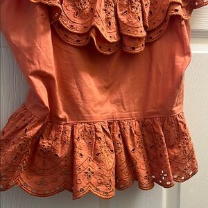 Stylish orange blouse with ruffled details. Eyelet design adds elegance. Perfect for casual or dressy occasions.