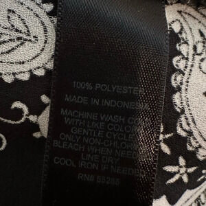 The black and white paisley pattern adds a whimsical, bohemian touch to the classic, gothic style. This blouse is machine washable and easy to care for. It comes in size M and is a regular fit. The top is perfect for any season and is made in Indonesia.