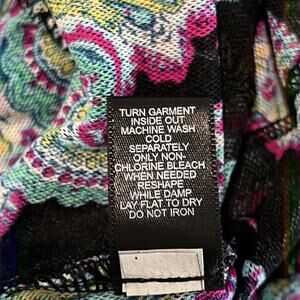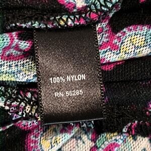 Black with colorful paisley print nylon knit tiered dress with adjustable straps