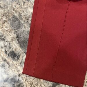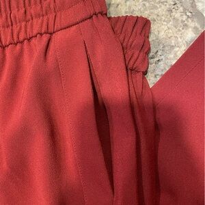 Dress pant from Express. Elastic waistband with tie detail and front pockets. Ankle length pant. Color is a cranberry red.