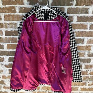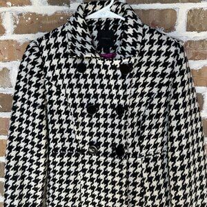 This size S small gorgeous Express Pea Coat is the perfect addition to any women's winter wardrobe. Made with pockets and with a wool blend outer shell and wool blend lining material, it's sure to keep you cozy during the colder months. The mid-length coat features a classic fit and button closure, as well as long sleeves with button accents. The houndstooth pattern in black and white gives it a timeless look that's perfect for any occasion, whether it's casual or dressy. This Express brand wool blend houndstooth black and white with accent button winter pea coat is in like new extremely clean condition, no stains, holes, or odor issues. Please review the pictures for more details and size measurements to ensure a proper fit, thank you.