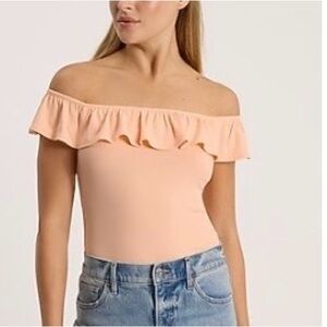 Elevate your style with this chic peach off-shoulder ruffle top. Perfect for any occasion, this top offers a blend of elegance and comfort.
