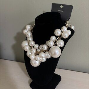 This is a bold statement necklace by Express, featuring oversized faux pearls in varying sizes. The pearls are clustered along a gold-tone chain, creating a dramatic and voluminous look. The design layers the pearls densely near the collar, making it ideal for elevating a simple neckline or adding a glamorous touch to evening wear. It’s a standout piece that commands attention—perfect for events, nights out, or dressing up minimalist outfits.