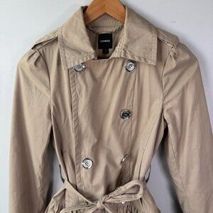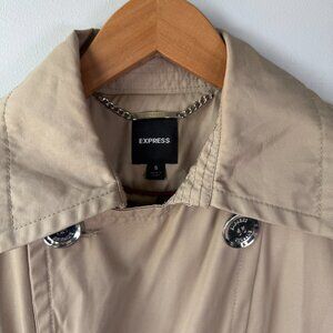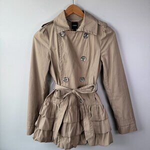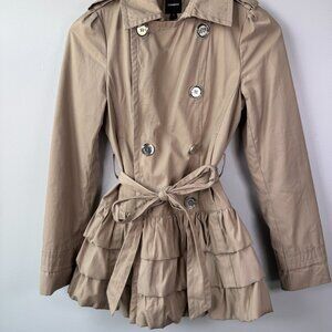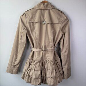 Express Peplum Ruffle Mid Length Neutral Tan Trench Coat with Belt Y2K Small
