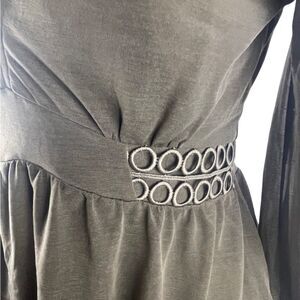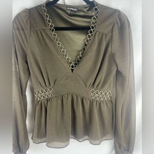 Express Peplum top brown olive green blouse long sheer sleeves v-neck sz XS