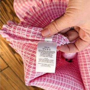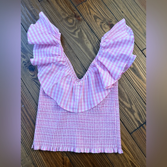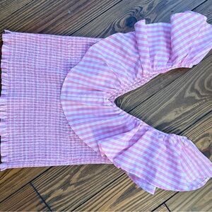 Stylish pink checkered blouse with elegant ruffles. Ideal for a chic ensemble.