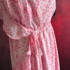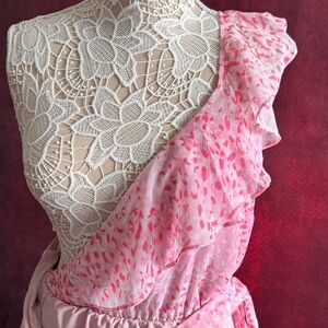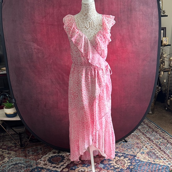 Chic high low dress with ruffle details. Wrap style for a flattering fit. Perfect for any occasion.