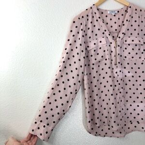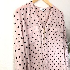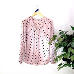 A beautiful light pink top with small black polka dots. A little sheer but still the perfect work shirt when worn over a tank top! Or wear for a night out! Working front zipper and real breast pockets. Buttons on the sleeves so they can be worn rolled up. A little bit of markings on the back shoulder, pictured.