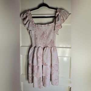 Pink Floral Express Ruffle Dress. In good condition. Size small. Front and back of dress are identical. Dress goes to knees. Dress has ruffled straps. Dress 98% polyester 2% spandex, lining 92% polyester 8% spandex offers accepted