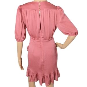 Chic wrap dress with ruffle details. Puff sleeves add elegance. Perfect for any occasion. More a salmon color than pink!