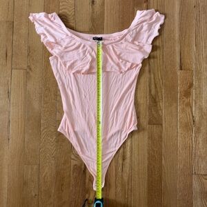 This Express bodysuit top in a soft pink hue features a romantic ruffled off-the-shoulder neckline. Crafted from a stretchy, lightweight fabric, it offers a form-fitting silhouette perfect for versatile styling.