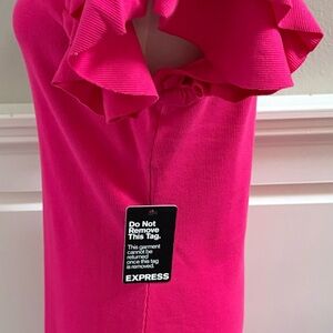 Step into elegance with this stunning pink midi dress from Express, featuring charming ruffled sleeves and a flattering fitted design. The smooth fabric and simple round neckline add a touch of sophistication, making it perfect for any stylish occasion.