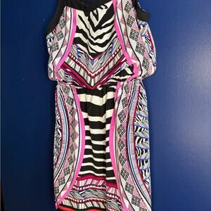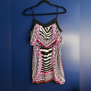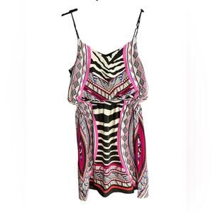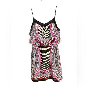 Y2K sundress from Express features a vibrant pink and black geometric print, perfect for casual resort wear. Designed with a sleeveless silhouette and spaghetti straps, it offers a breezy and stylish look. The mini length adds a playful touch, making it an ideal choice for sunny days. See pictures for small flaws. Adjustable straps. Size XS. Length 34.5” chest 17” across flat armpit to armpit. Y2K
