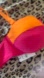 Vibrant bikini top with bold pink and orange colors. Stylish and eye-catching design. Perfect for beach days.