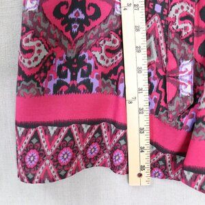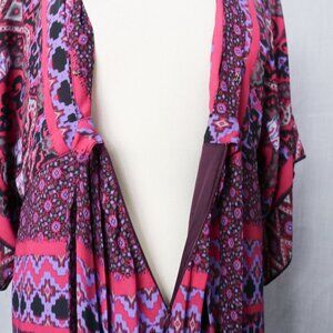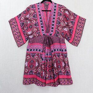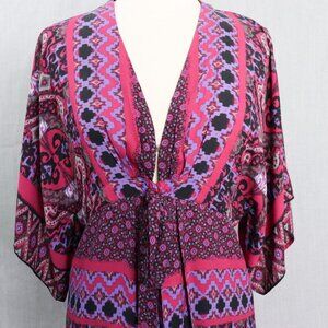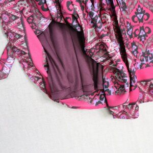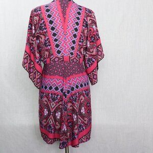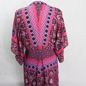 Vibrant pink and purple dress. Features intricate patterns. Flattering V-neck design. Perfect for any occasion.