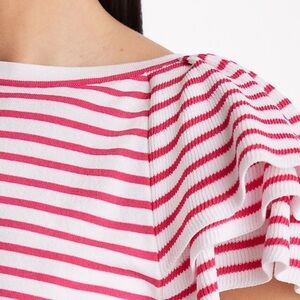 A cozy sweater is a great addition to your wardrobe. This style features short ruffle sleeves and a classic striped print, perfect for transitioning seasons.