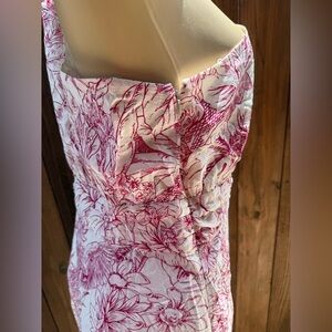 This stunning sundress by Express features a chic one-shoulder design with a flutter sleeve, perfect for a wedding guest or cocktail event. The dress showcases a beautiful pink and white watercolor floral print, complemented by a ruffled, tiered skirt that adds a touch of elegance and movement. Its fitted bodice and flared silhouette create a flattering and romantic look, ideal for resort wear.