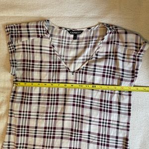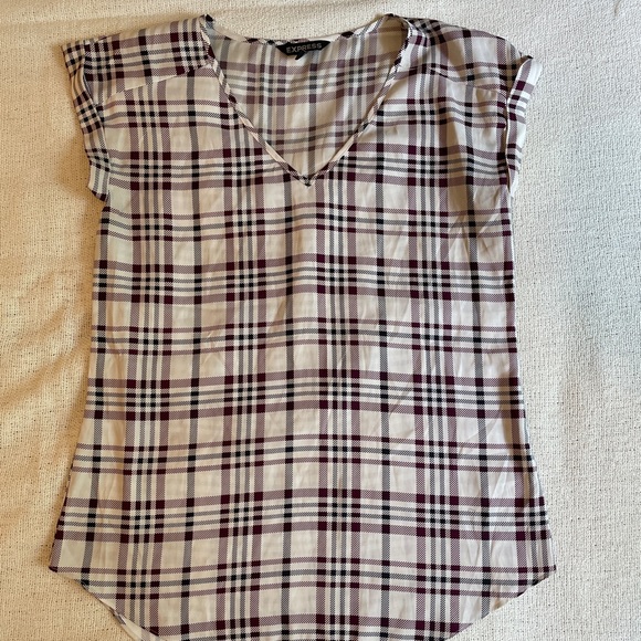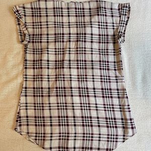 Burgundy, garnet, maroon and black plaid on white blouse.