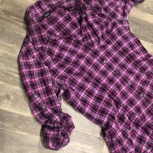 Express plaid button down that pairs great with jeans and heels or throw a vest and some boots on. I love the the bright purple/fuchsia color with the silver detail. Takes an ordinary button down and makes it dressy! In excellent used condition. Size M (underarm:19” Length:25”)