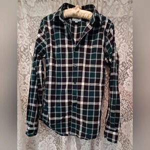 Western plaid style button up front men's casual shirt. size S/P extra slim 14-14 1/2 (small petite). green/black/white. young men's. long sleeve. button cuffs. like new condition.