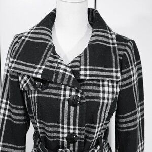 Express Plaid Coat Mod Academia Goth Classic Wool Blend Funnel Neck Long Peacoat