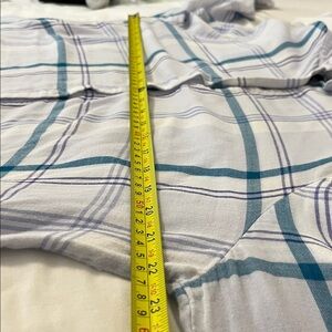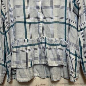 Blue and white plaid button down top with a light gauzy feel. Long sleeves. Collared neckline. Peplum ruffle hem. Slight high low silhouette.