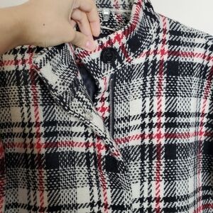 Excellent condition. Black, White & Red. Plaid print. Ribbed knit sleeves. Thumb holes. Full zip jacket. Snap & Button closure. Two pockets. Satin like lining. Fits oversized, would also fit a size Medium & would be good to have room to layer underneath!