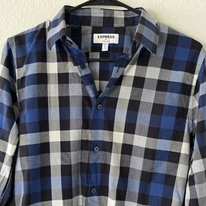 Express Plaid Shirt Mens Sz S Blue Black White Long Sleeve Button Up Academia