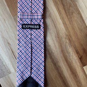 Express plaid tie with orange (not red) and blue. Its a very soft flat plaid with a smooth finish, but no sheen.
