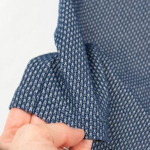 - Navy polo with white pattern and white stripe on collar and sleeve
