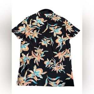 Name: Express Brand, Stylish black shirt with vibrant orange and blue floral patterns. Perfect for casual outings.