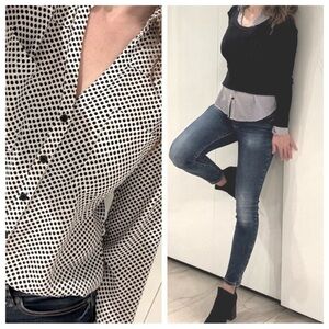 The favorite Portafino in a classic polka dot print. Button closure. Adjustable sleeves. 20” across bust and 27.5” long.