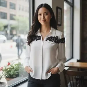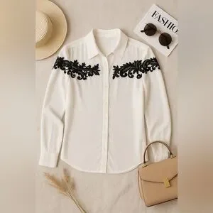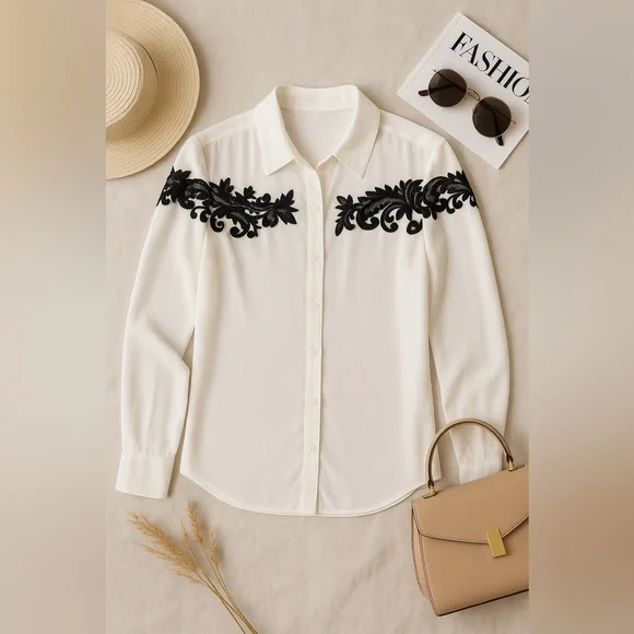 This Express Portofino blouse features a crisp ivory base with black lace embroidery across the shoulders and upper chest. Designed with a lightweight, flowy feel, it offers a polished option suitable for both professional and casual wear.