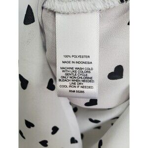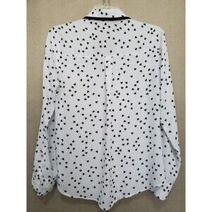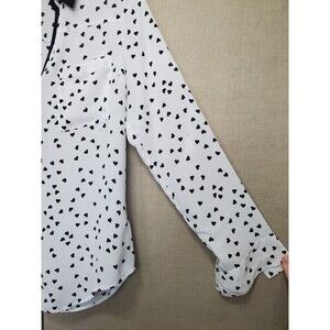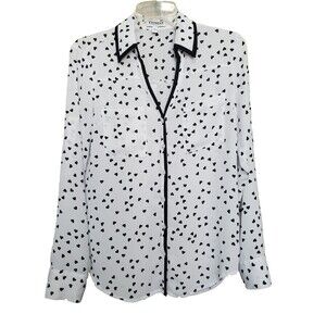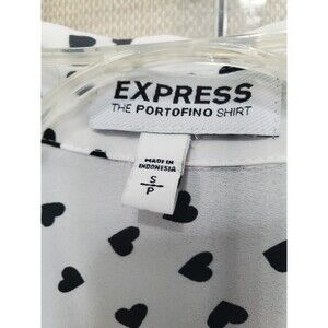 This is a Express Portofino White Heart Print Black Trim Roll-Tab Sleeve Button-Up Shirt Small