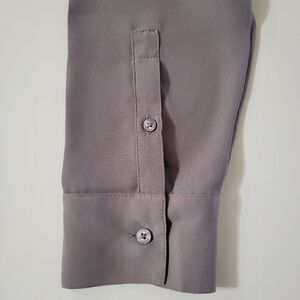 Beautiful & classy taupe v-neck button down Portofino blouse from Express has tailored detailing. Black collar and trim down the front adds a chic look to this sharp piece. The long sleeves have button tabs to shorten up the length. NWOT