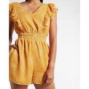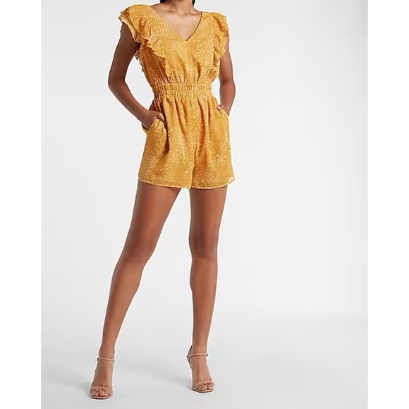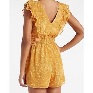 Perfect for everything from parties to date night, this romper is a fast favorite thanks to a sleek v-neck, ruffle sleeves and bold print. Stretch waistband; Slant hand pockets; Straight hem