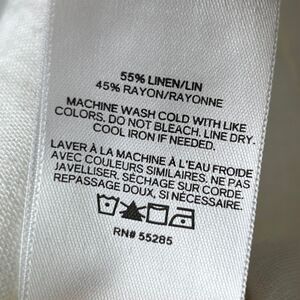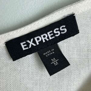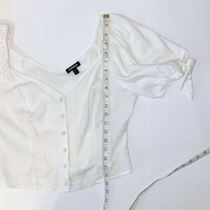 Express Puff Tie Sleeve Button Front corset style slightly cropped linen top in white cream. This beautiful cottage core style top by Express has a corset style look but no boning and instead is made of a breezy linen fabric blend. Fully button front, puff sleeves with ties. Perfect shirt for spring and summer with shorts or jeans for a casual look or amped up with a maxi skirt for more formal vibes! Excellent used condition. Women's size M medium, measurements pictured.