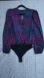 Chic bodysuit with vibrant purple and teal pattern. Long sleeves and sleek design.