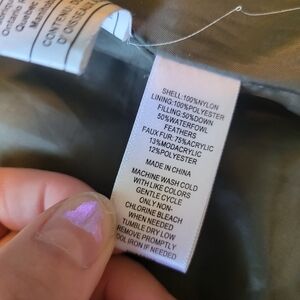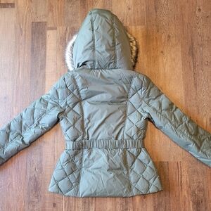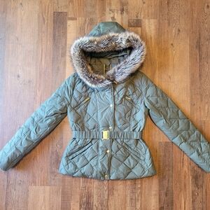 Express Quilted Green Jacket Coat with Faux Fur Hood