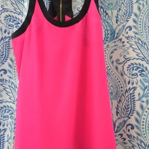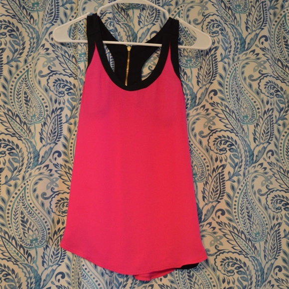 Pink with Black trim and accents at bottom of the tank top. 100% polyester. Gold zipper in back.