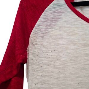 Express Raglan Sleeve Shirt in classic white with bold red 3/4sleeves โ a sporty and stylish addition to your casual wardrobe. Size Medium. This lightweight, sheer tee offers a relaxed fit and is perfect for layering or warmer days. Please note: there is some pilling under both arms (see photos). Priced accordingly. ๐โจ