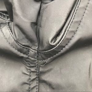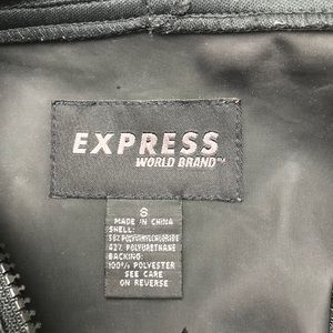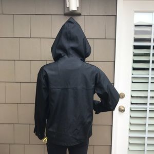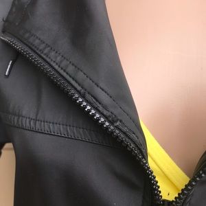 Short black rain jacket by Express, size small. Two small front zipper pockets, adjustable strap on the sleeves, draw string on the hood. This is a preowned jacket and shoes some sign of wear. Please see a picture of small tear in plastic cover under the armpit, also small flakes on the inside of the zipper.